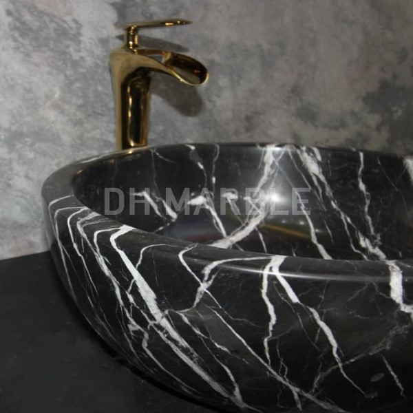 حوض غسيل رخام بلاك توروس يجذب الانتباه بتصميمه العصري والأنيق للغاية. ومع العروق البيضاء على رخام بلاك توروس، يبدو وكأنه عمل فني. الجزء الداخلي من حوض المغسلة، المصمم على شكل بيضاوي، باللون الأسود العادي. يوجد في الجزء الخارجي من الحوض عروق بيضاء ذات درجات اللون الأسود والبني. تم تصميم الجزء الداخلي من الحوض على أنه مصقول، بينما الجزء الخارجي غير مصقول.