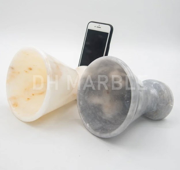 حاملات الهواتف الرخامية تجلب متعة الاستماع إلى الموسيقى إلى المستوى التالي. تم تصميمها على شكل جرس دائري يفتح للخارج ليجعل صوت الموسيقى أعلى وينتشر على مساحة واسعة. الرخام، الذي يسمح بانعكاس الصوت، أبيض اللون. الجزء الميكانيكي مع الساعة الرقمية في الخلف باللون الأسود. وبهذه الطريقة، يتم تحقيق الانسجام المثالي بين اللونين الأسود والأبيض في المنتج.